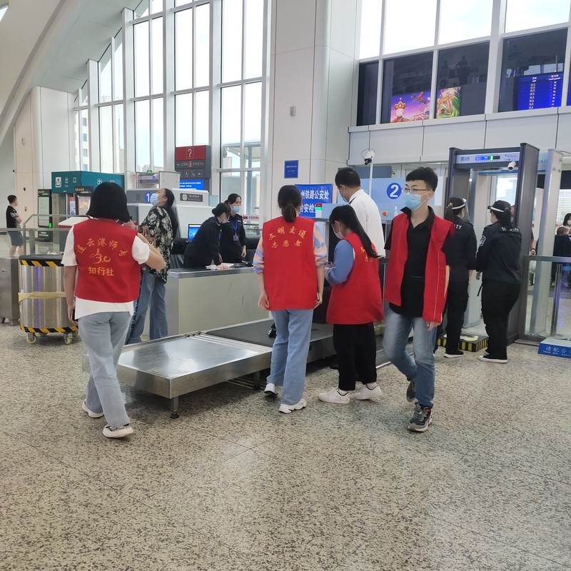 志愿者每天到达火车站后,工作人员都会就如何开展“爱心导乘”志愿服务等方面内容向志愿者们进行培训。接着,身着橙色小马褂,脖带志愿挂牌,胸前再佩戴着“青年志愿者”绶带的知行社志愿者就开始了一天的工作。热情的志愿者面对每位旅客都会露出暖心的笑容,在行李传送带的周围总能看到志愿者帮助旅客搬运大件行李的身影;在自动售票处附近总能听到志愿者耐心为旅客解答问题的声音;只要有人经过就提醒旅客“请佩戴好口罩,保持距离”;志愿者还会劝导旅客遵守公共秩序,文明检票,有序进站,引导乘客文明乘车,耐心解答旅客咨询,及时解决旅客换乘等问题。