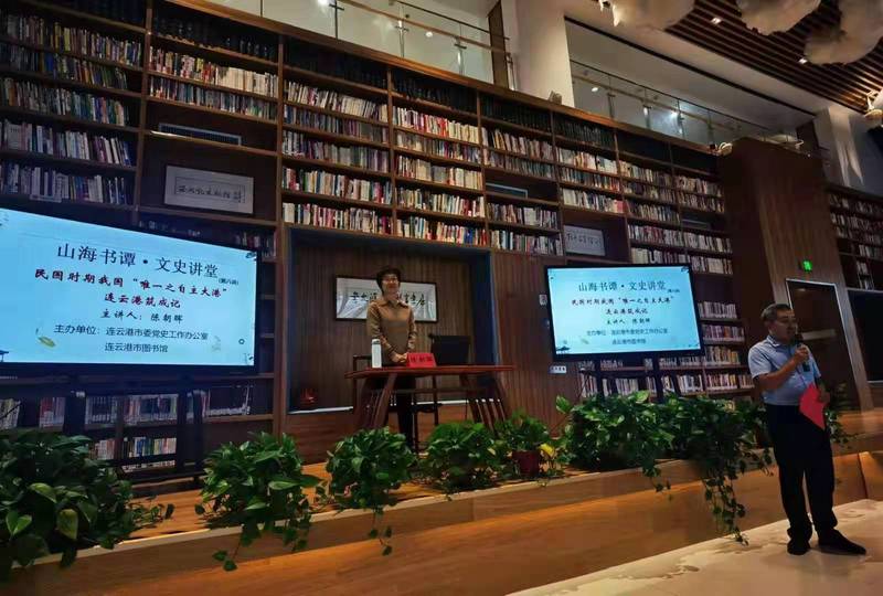 为庆祝伟大祖国72周年华诞,连云港市委党史工作办公室与连云港市图书馆共同举办“山海书谭·文史讲堂”国庆系列讲座,10月7日下午在连云港市图书馆五楼共享书房,谈球吧陈朝晖老师应邀作专题讲座。活动由市图书馆馆长梁继东主持,全市百余名地方文史专家、学者及爱好者聆听了讲座。