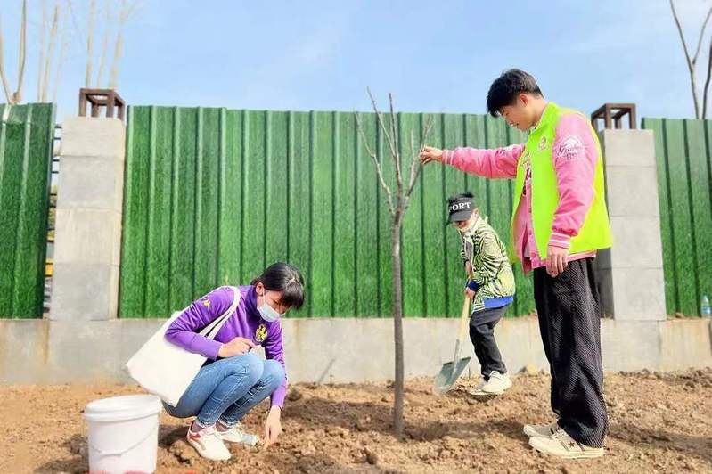 活动中,志愿者为每个家庭分发树苗以及铁锹等工具,找到合适的栽种地点后,大家便热火朝天地忙碌起来,挖坑、扶小树苗、填土、浇水,现场一派火热景象。小树种好后,小朋友们还为它挂上了写有姓名的名牌,约定好与小树一起“长大”。