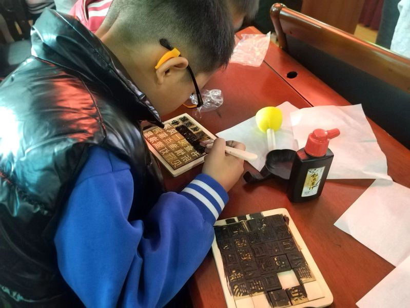 活动伊始,社团成员们带领小员工们进行猜谜语游戏,活跃课堂氛围,导入课堂内容。课堂中,社团成员们通过口述、播放图片和小视频等方式引导小员工们了解我国古代四大发明的内容与意义。理论学习后,社团成员们带领小员工们开展了“体验活字印刷,让文字活起来”手工活动。小员工们通过对文字进行排列组合,再沾墨、印刷形成完整诗句,领略中华传统文化的魅力,体验活字印刷的乐趣。