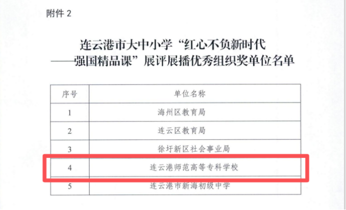 近日,连云港市教育局办公室公布了全市大中小学“红心不负新时代——强国精品课”展评展播获奖名单和优秀组织奖单位名单。我院王华影老师、贺明卫老师获特等奖,集团获优秀组织奖。